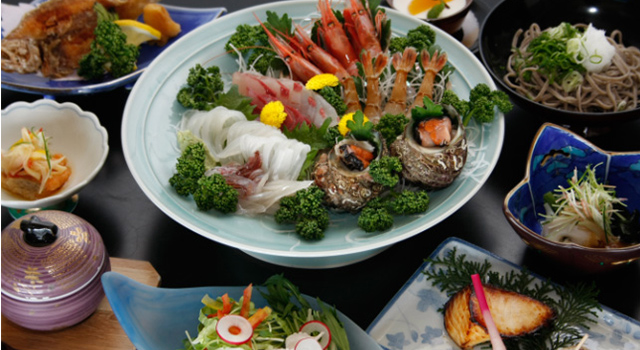甚平の自慢は豪華海鮮会席料理。旬の海の幸はもちろんのこと、地元で採れた新鮮なあわびや日替わりで旬の地魚料理をふんだんに味わえます。